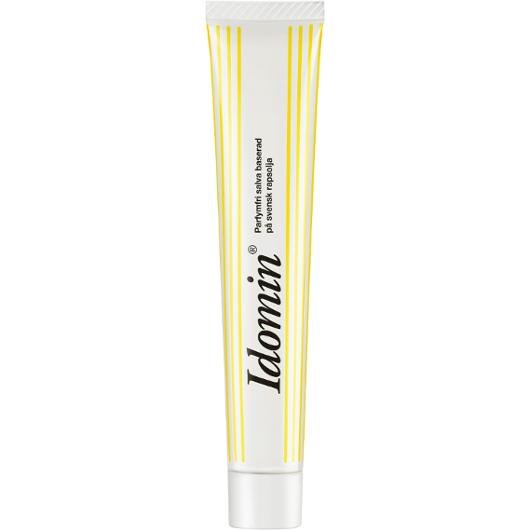 Idomin är baserad på svensk rapsolja och tillverkas i Falun. Idomin har funnits sedan 1943 och är en säker och beprövad salva som blivit många familjers favorit mot torr, sprucken och irriterad hud. Passar lika bra till röda babystjärtar som till nariga händer och torra läppar. Idomin skyddar också mot snö, vind och kyla och räddar såväl vinterhänder som förkylningsnäsor. Används även till torra tassar och hästens karleder. Idomin salva vårdar och skyddar din hud med hjälp av mjukgörande oljor, zink och antioxidant vitamin E. Idomin är helt vattenfri och vattenavisande. Den är dermatologiskt testad på känslig hud och fri från konserveringsmedel, parfym och färgämnen. Idomin är väl testad på känslig hud och mycket lämplig för barn.