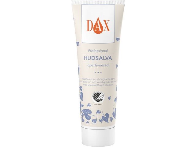 DAX Professional hudsalva är en mjukgörande och lugnande salva för extra torr och känslig hud. Regelbunden kontakt med vatten torkar ut huden. Om vintern är det dessutom lätt att få problem med torr hud, både av kylan och av torr inomhusluft. Många behöver också extra fukt på sommaren, när sol och bad torkar ut den känsliga huden. Hudsalvan är baserad på vegetabiliska oljor och innehåller solrosolja, allantoin och vitamin B5 som hjälper till att återuppbygga hudens naturliga barriär. Miljömärkt med Svanen.