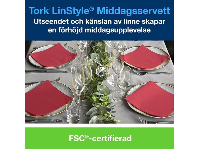 Vackra pappersservetter med en underbar linnekänsla som ger ett elegant intryck! Gör ett gott första intryck med högkvalitativa Tork LinStyle Middagsservett. Dessa servetter ger ett lyft till middagsupplevelsen eftersom de både ser ut och känns som premiumlinne. Dessutom är de mjukare och tjockare än vanliga pappersservetter, så gästerna kommer att märka skillnad. Spill torkas enkelt upp på ett ögonblick med den extra absorberande kvaliteten som sparar personalen både tid och ansträngning. Överlägsen absorptionsförmåga vid upptorkning av spill Matcha din lokals inredning med brett urval av moderna och klassiska färger.