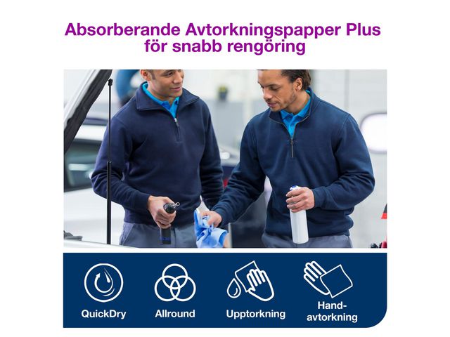 Stark allround-kvalitet, perfekt för avtorkning av händer och lätt smutsade ytor. På hektiska arbetsplatser behöver personalen snabbt och effektivt kunna ta hand om spill. Tork Avtorkningspapper Plus är den perfekta allround-lösningen för att torka upp vätskor och hålla händerna rena. Perfekt för att torka, suga upp oljespill. QuickDry-teknologi gör pappret mer absorberande än vanligt avtorkningspapper och ser till att uppgifter kan lösas effektivt och med mindre avfall. Tork Easy Handling plastförpackning gör det enkelt att bära och göra sig av med förpackningen. Kompatibel med Tork W2, W1 dispensrar.