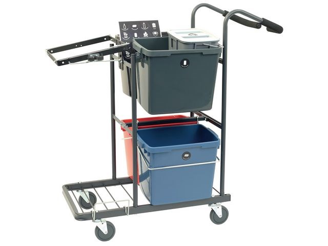 Praktisk och flexibel vagn för källsortering. Flexibel källsorteringsvagn med sex fraktioner i varierande storlek. Hållare för 125L säck, 4 x 25L backar färgkodade och 12L kärl med lock anpassat för matavfall. Karta med märkn... Läs mer