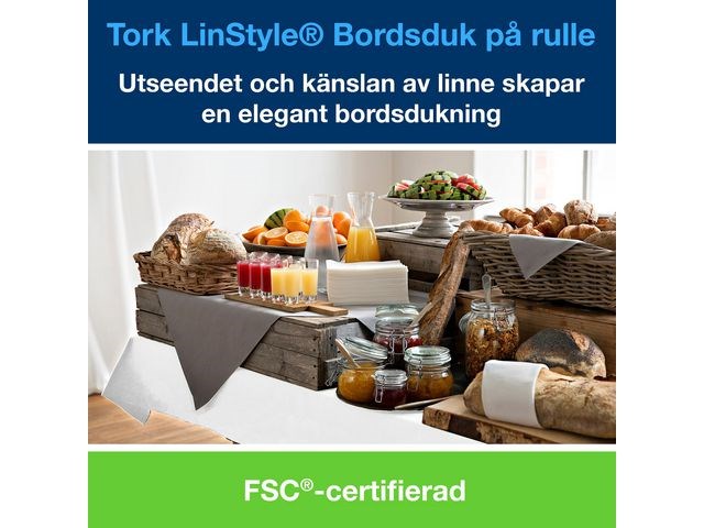 Höj dukningen till en ny nivå med denna kvalitetsengångsduk i linnestil! Tork LinStyle(®) bordsdukar på rulle i premiumkvalitet passar på restauranger med fullbetjäning, där det är extra viktigt att göra ett gott intryck på gästerna. Bordsdukarna både ser ut och känns som riktig textil och är märkbart mjukare och tjockare än vanliga pappersprodukter. Dessutom är de extra absorberande. Ge dina kunder en elegant upplevelse med vår linneduk som finns i en rad klassiska färger.