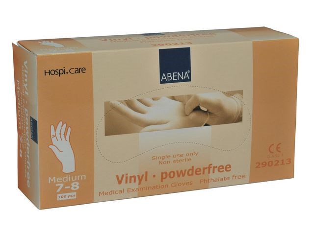 Puder- och ftalatfri vinylhandske ifrån ABENA för engångsbruk. Elastisk engångshandske tillverkad av polyvininylklorid. Uppfyller krav enligt EN-455. Kan användas till enklare rengöringsuppgifter och hantering av icke feta livsmedel. Innehåller ej latex och kan därför användas vid latexallergi.