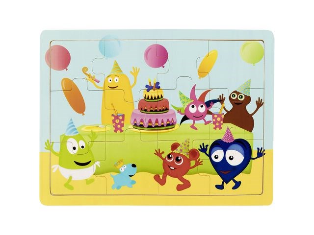 Pussla fram de busiga Babblarna när de är på kalas! Gediget träpussel med motiv från Babblarnas värld, Babblarna på kalas i 12 bitar.