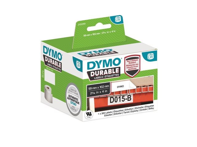 När du konfronteras med utmanande ytor, använd etiketter som är starkare och håller längre än pappersetiketter. Dymo Durable shipping label för LabelWriter, 59x102mm, 300 etiketter, extra starkt lim, vit. Dymo LabelWriter Durable labels har industri-graderat lim och en tuffare yta som motstår upprivningar och avskavningar som uppstår vid värme, fukt och lösningar. Dymos LabelWriter Durable Labels är perfekta för hyllor, golvmarkeringar, lagring av kemiska vätskor och mer.