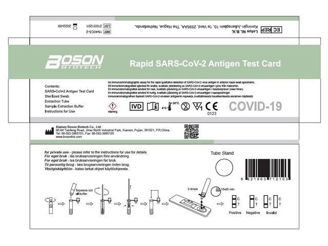 - snabbt och enkelt! Svar inom endast 20 minuter. En CE-märkt medicinteknisk produkt. Covid 19 påminner oftast om en vanlig förkylning eller influensa. Symtomen visar sig generellt inom 3-5 dagar efter att du har blivit smittad. I vissa fall kan det dröja upp till 14 dagar. Om du misstänker att du har blivit smittad av Covid 19 kan du snabbt och enkelt testa dig genom topsning i näsan och få svar inom 20 minuter. Testet ska tas inom de sju första dagarna efter uppkommen symtom. Testet ersätter inte vårdens tester. Självtest BOSON Antigen Rapid Test kräver inte utbildad vårdpersonal. Passar för användning av både privatpersoner och företag. Klarar även av att detektera för EG 5 samt för EG 5.1. Produkten är CE-märkt. Det finns ett test per förpackning och är endast för engångsbruk.