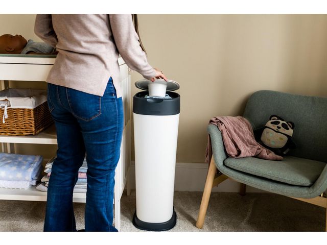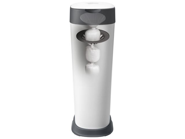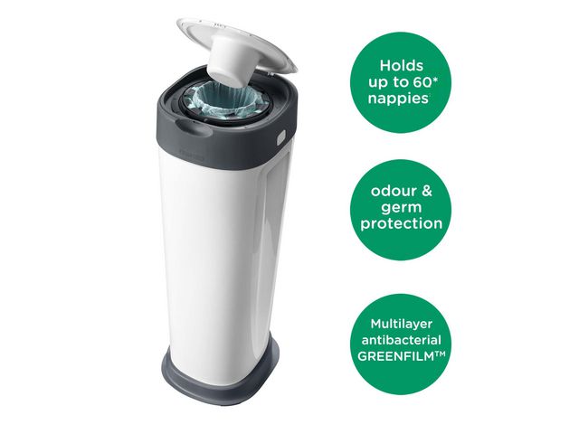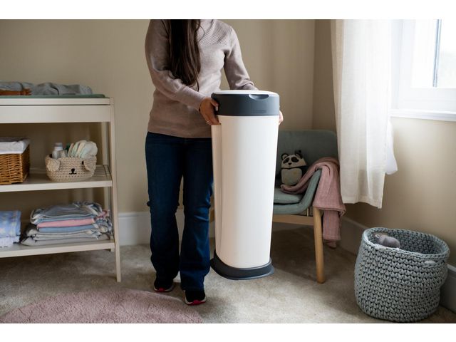 Detta är en ny version av Sangenic MAXI blöjhinken. Modern design för att passa såväl dagis och förskolor, som hemmiljö. Kan förvara upp till 60 blöjor. Garanterat lukt- och bakterieskydd. Man trycker bara ner blöjan i öppningen, kolven pressar sen ner blöjan i hinken. Twist and Click systemet snurrar in och förseglar varje blöja en och en i flerskikts plastfilm, som dödar 99% av alla illaluktande bakterier. Med nya effektiva Twist and Click systemet går det åt mindre med plast. Höjden på blöjbehållaren är skonsam för ryggen eftersom du inte behöver böja dig eller sträcka dig ner