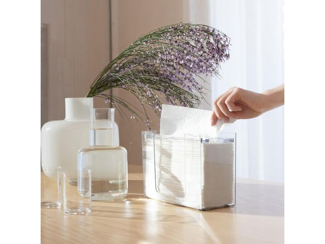 Praktisk transparent bordsdispenser för Katrin handdukar. Med denna praktiska dispenser kan du alltid ha handdukar nära till hands överallt i hemmet. Dispensern gör det enkelt för dig att alltid ta precis rätt mängd papper, även när du bara har ena handen över. Matar fram ett ark i taget, laddas med en bunt Katrin non stop handdukar. Passar även hushållsark Lambi Home Towel eller Serla Handy.