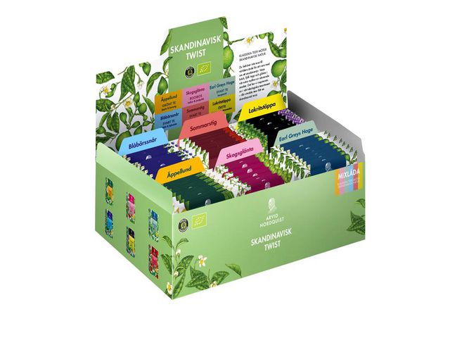 - koppla av med en varm kopp te med riklig och god smak! Mixlåda som passar utmärkt på arbetsplatsen! 6 x 15 st påsar i varje mixlåda. En skandinavisk twist på utvalda frukter, bär och kryddor! Te med hög kvalité i ett ekologiskt helhetskoncept med svart-, grönt, rött- och ört-te. Smakerna som finns i lådan är Blåbärssnår, Sommarstig, Lakritstäppa, Äppellund, Skogsglänta och Earl Greys Hage. Det breda sortimentet av smaker hos Arvid Nordqvist gör att det finns en smak som passar alla, till varje tillfälle. Produkten är rättvisemärkt. Tepåsen är också helt plastfri och komposterbar.