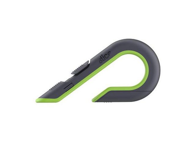 SLICE Auto-infällbar lådkniv ger maximal säkerhet tack vare ett ergonomiskt, skyddande J-krokhandtag och unika säkerhetsblad. Lämplig för många material, inklusive enkel- och dubbelväggig wellpapp. Undvik skador med denna kartongkniv som förhindrar att man av misstag lämnar bladet exponerat tack vare dess automatiskt fjäderbelastade tillbakadragning av bladet. Ergonomiskt nylonhandtag med halkfritt grepp. Bladen är 100% zirkoniumoxid och är icke-gnistrande, icke-magnetiska och kemiskt inerta som tål temperaturer upp till 1600°C och rostar aldrig. - Skärdjup: 8,5mm
