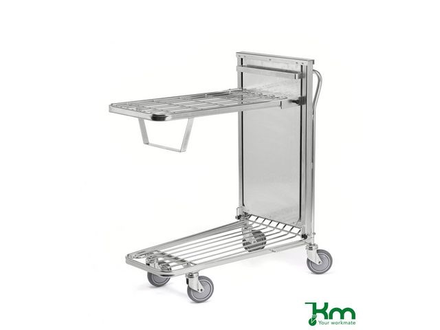 Elförzinkad, klarlackad och stackningsbar butiks-och lagervagn. Det övre hyllplanet är fjädrande för att få en ergonomisk arbetshöjd. Fjädrar vid belastning 0-90kg, efter 90kg har hyllan nått sitt lägsta läge. Levereras omonterad.