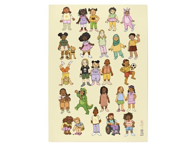 En härligt inkluderande affisch som passar lika bra i lekrummet och väntrummet, som i barnens sovrum. Vi människor ser ju olika ut, och självklart ska det speglas i barnens miljö. Bilderna speglar en mångfald utifrån olika kroppsformer, etniciteter och funktionsvariationer. Mångfald är viktigt för alla barn, genom att visa barn människors olikheter kan vi lära dem människors lika värde.
