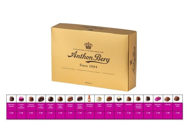 Klassisk guldask med ett urval av härliga chokladpraliner Anthon Bergs Guldask 400g med ett urval av härliga chokladpraliner. En ask att dela med familj och vänner. Ge bort som gå bort present eller till någon du tycker om. Chokladen innehåller inte gluten. Innehåller 18st olika praliner, nougat, kokosboll, marsipanbröd, nöttryffel, jordgubbstryffel, mjölkchoklad med mera. Dansk "chokolade" när den är som allra bäst.