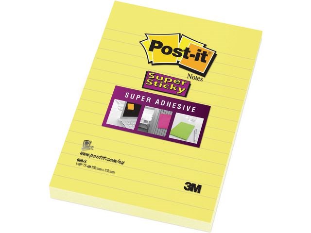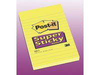 De här linjerade Post-it®-notislapparna är perfekta för anteckningar under möten eller kontorsinformation. De tryckta linjerna hjälper dig hålla dina anteckningar prydliga. Notislapparna kan även användas till mycket annat, som att snabbt skriva ner ett telefonnummer och en att göra-lista, eller att anteckna idéer och lämna meddelanden till kollegor, vänner och familj. De här extra stora Super Sticky-notislapparna är tillverkade av PEFCT-certifierade pappersfibrer och är ett miljömedvetet val för dina anteckningar. Dessutom har lapparna ett klister som är tillverkat av 60 % återvunnet material. Med de flyttbara notislapparna kan du enkelt fästa, ta bort och flytta dina anteckningar utan att lämna märken på ytor som arkivskåp, dörrar och väggar eller inuti kalendrar, pärmar och anteckningsböcker. Varje 100 x 152 mm-block består av 75 Super Sticky-notislappar som adderar personlighet till dina idéer och får dina anteckningar att sticka ut.