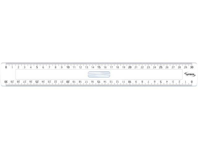 30 cm lång glasklar linjal av plast. Med ett litet handtag så att du kan hålla linjalen på plats mot underlaget. Centimetermått på båda sidor. Tillverkad av transparent styrenplast.