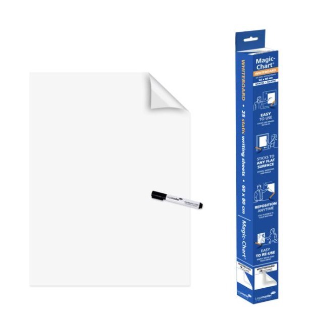 Legamaster Magic-Chart Whiteboard är ett vitt elektrostatiskt blädderblock som du kan använda för att när som helst presentera dina idéer. Magic Chart behöver inget klister för att fästas i ytor och lämnar inga spår efter sig. Det elektrostatiska foliematerialet fästs enkelt i alla slags ytor (trä, betong, glas, tapet) vilket innebär att du kan presentera dina planer eller idéer var som helst. Det går att skriva på Whiteboard Magic Chart med alla slags märkpennor, vilket gör det väldigt flexibelt. Bläcket kan torkas av och blocket kan användas på nytt. Dessutom går det att fästa presentationskort och notiser på ytorna utan att använda klister. Blocken är helt återvinningsbara, vilket gör den här produkten till ett miljövänligare alternativ. Förpackningen innehåller en TZ 100-whiteboardpenna för extra bekvämlighet.