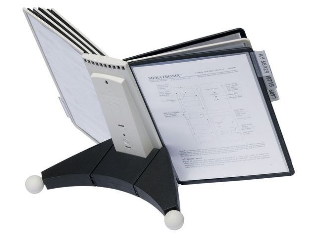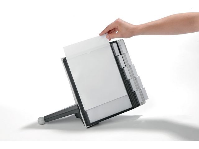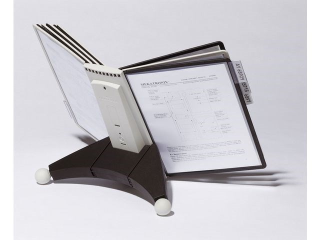 Robust bordsstativ med 10 SHERPA visningspaneler i A4-format. Kompletta uppsättningar inklusive ett modulärt bordsstativ, SHERPA visningspaneler i A4-format och indexflikar med tomma insticksetiketter. Bordsenheterna är stabila och halkfria. Varje förlängningssats har 10 visningspaneler. Komplett med fem röda och svarta paneler eller fem grå och svarta paneler. Tillverkad av PVC. - Kan användas tillsammans med DURABLE produktkod(er): 560919