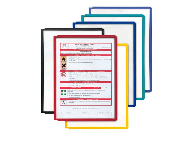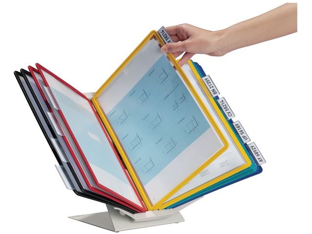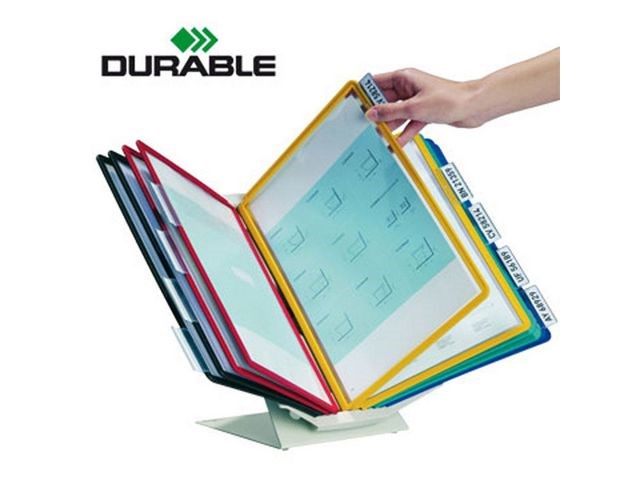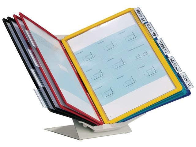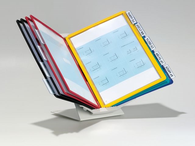 DURABLE VARIO® PRO 10 levereras med 10 genomskinliga visningspaneler som rymmer upp till 20 A4-ark för enkel läsning. Placera detta skyltningssystem på skrivbord och bordsskivor för handsfreeläsning. Varje panel är lätt att vända upp till 90 grader och visar information på båda sidorna. Infoga enkelt dokument i de genomskinliga panelerna i denna demobok. Panelerna är tillverkade av polypropylen och basenheten är tillverkad av metall för hållbarhet. Dokumenthållaren DURABLE är utrymmesbesparande och mångsidig, och kan bland annat hålla produktinformation, prislistor och presentationer. Tillverkad av PVC.