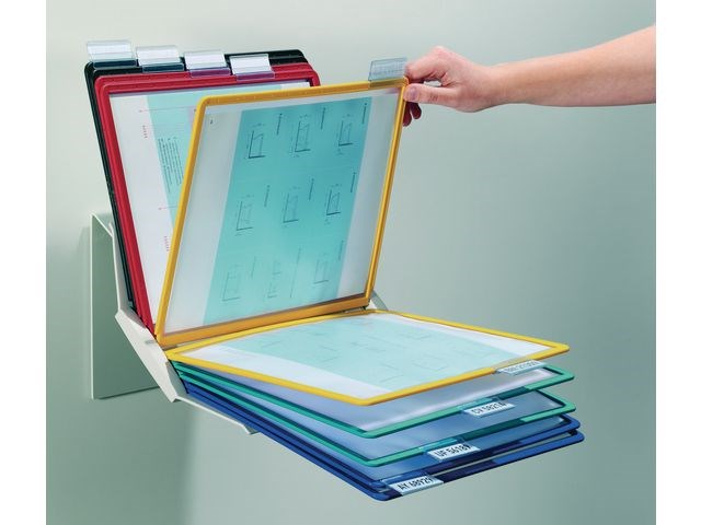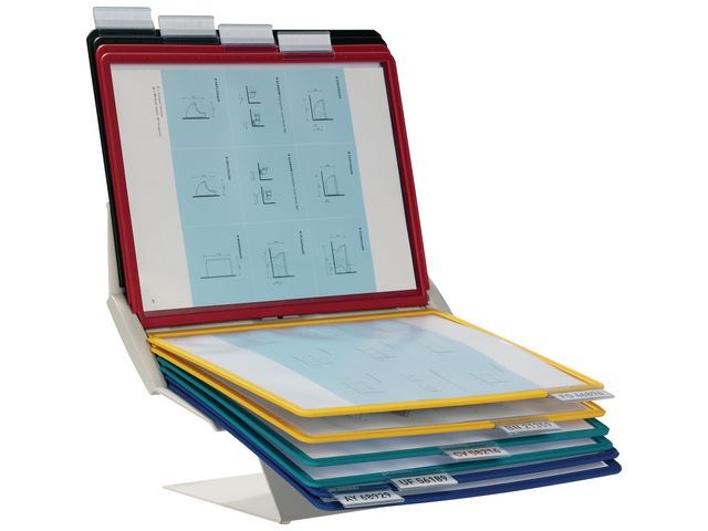 DURABLE VARIO® PRO 10 levereras med 10 genomskinliga visningspaneler som rymmer upp till 20 A4-ark för enkel läsning. Placera detta skyltningssystem på skrivbord och bordsskivor för handsfreeläsning. Varje panel är lätt att vän... Läs mer