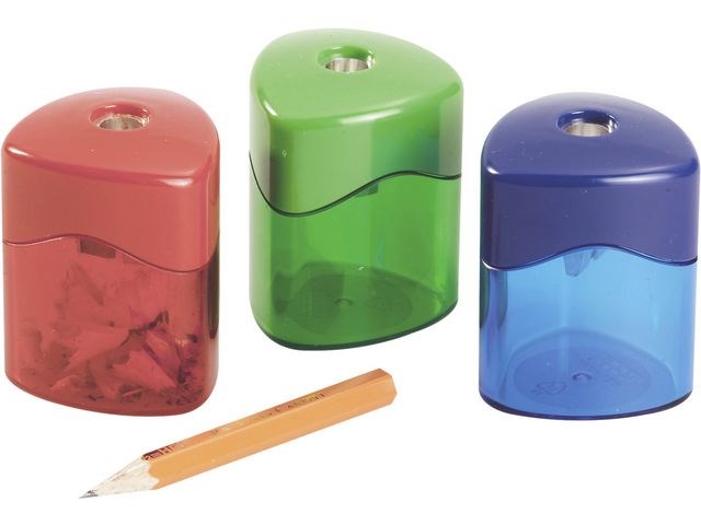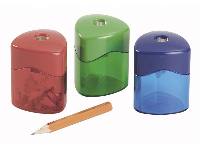 Högkvalitativ pennvässare med praktisk behållare. Handmodell för vanliga blyertspennor. - Sorterade färger