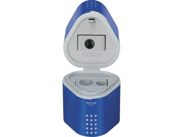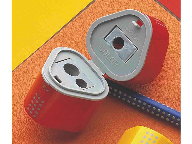 Ergonimisk pennvässare med tre olika öppningar. Anpassad för traditionella, trekantiga Grip pennor. Faber-Castell Colour GRIP 2001 Trio pennvässaren har 3 olika öppningar så att du kan vässa blyerts-, jumbo- och färgpennor. Pennvässarens ergonomiska trekantiga form gör den enkel att använda. Pennvässarna har extra skarpa stålblad och designen skyddar stiftet och förhindrar att det bryts. Denna pennvässare har en stor dubbel behållare som samlar upp resterna och hjälper dig att hålla rent omkring dig.