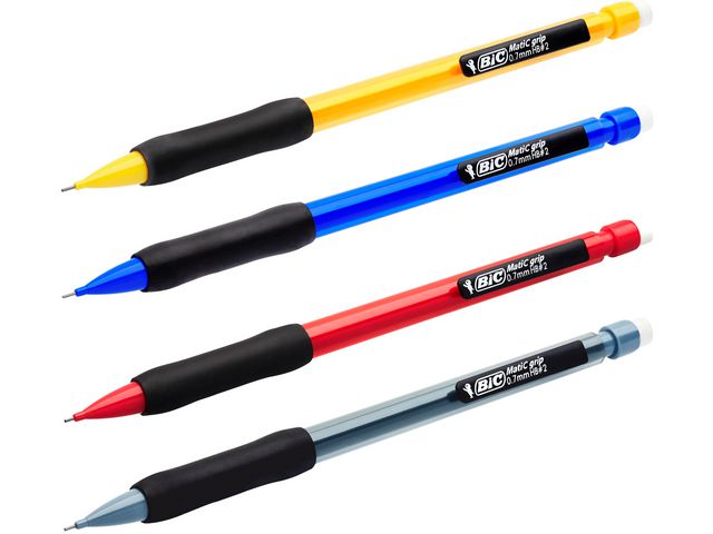Den mekaniska stiftpennan BIC® Matic Grip har ett inbyggt suddgummi och snygg design. BIC® Matic Grip passar utmärkt för dagligt skrivande. Det bekväma gummigreppet ger stadig hand, så att du kan skriva jämnt och tydligt. Pennans spets ger jämna linjer, så att föreläsnings- och mötesanteckningar blir klara och tydliga. Den automatiska blyertspennan innehåller 3 HB-stift och räcker mycket länge. Fickklämman är praktisk. Du kan ha stiftpennan på dig hela tiden genom att fästa den på bland annat skjortficka, anteckningsblock och mappar.