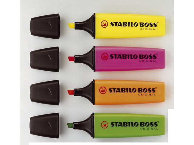 Markera text och viktig information med den klassiska överstrykningspennan STABILO® BOSS® ORIGINAL med Anti-Dry-Out-teknik. Originalöverstrykningspennan STABILO® BOSS® har ett tillförlitligt vattenbaserat bläck med Anti-Dry-Out-teknik så att korken kan vara av under 4 timmar utan att den torkar ut. Den kan användas på nästan alla typer av papper. Den har en snedskuren spets som ger dubbla linjebredder på 2 respektive 5 mm så att du kan använda den i många olika sammanhang, till exempel för att skriva, stryka under eller markera. Överstrykningspennorna från STABILO® passar perfekt för studenter och yrkesverksamma som måste läsa och markera viktig information i texter. Överstrykningspennan har den klassiska BOSS®-formen med en platt pennkropp som inte rullar iväg. Kollektionen levereras i en lättillgänglig plastförpackning och innehåller ett urval av 4 levande färger.