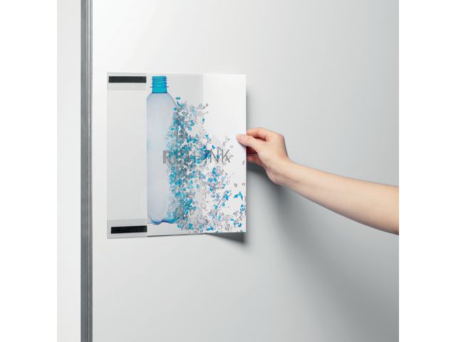 Magnethäftande ficka med glasklar front utan tryck Visar och skyddar inlagan med information för uppsättning på whiteboardtavlor, omklädningsskåp, dörrar och andra metallytor på t ex gym, verkstäder och produktionsanläggningar. Glasklar front utan tryck, med vikt över- och underkant, som bildar en profil, som pappret skjuts in i från sidan. Magnethäftande ficka av 80% post-comsumer återvunnen rPET plast.
