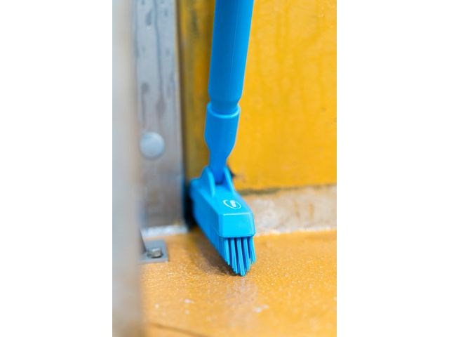 - för svåråtkomliga utrymmen. Rengör effektivt under och mellan maskiner och utrustning med en fogborste med justerbar vinkel som till och med kan användas med skaft parallellt med golvet. De pilformade filamenten når in i små sprickor och fogar samtidigt som mellanraden med hårda filament ger hög skrubbningseffektivitet.