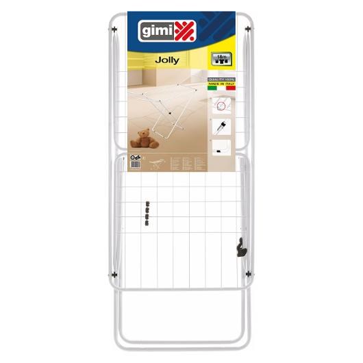 Vileda Gimi Jolly Torkställning (golv) för inomhusbruk. 18 mtr torklängd. Klassisk och kompakt torkställning. Lätt att fälla upp, enkel att flytta och tar minimalt med plats vid förvaring. Storlek: 180 x 55 x 93 cm. Metall.