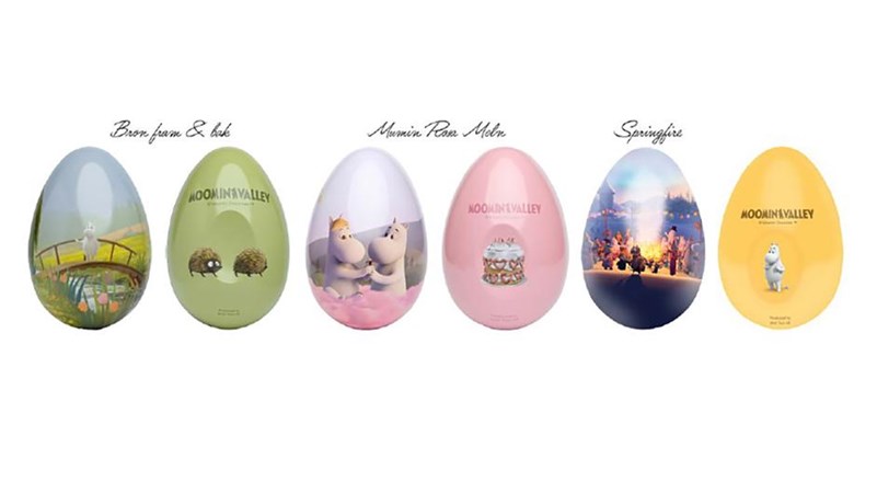 Färgglada plåtägg fyllda med gott godis och charmiga motiv av Muminfigurer. Inslaget godis i plåtägg med underbara motiv av populära Mumin, kommer i 3 olika design och våriga färger