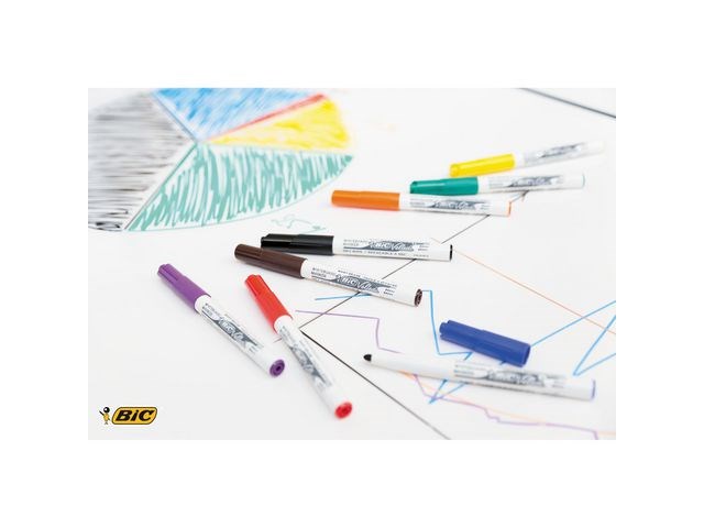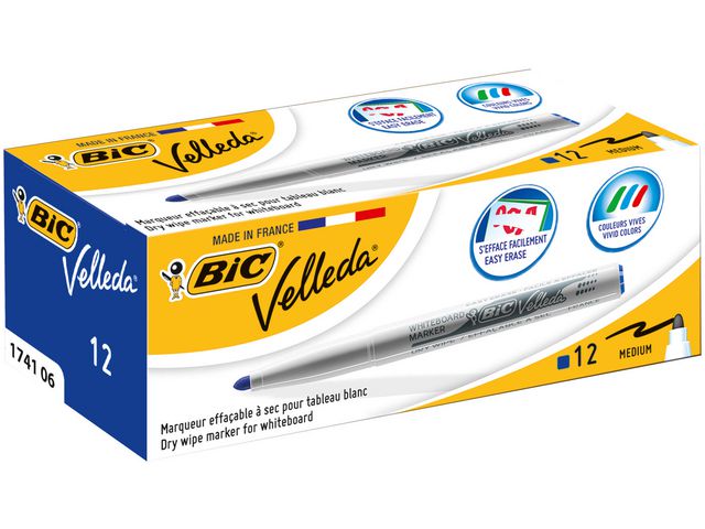 Den här BIC® Velleda® 1741 whiteboardpennan ger fin skrift på alla whiteboardytor. Dessa BIC® Velleda® whiteboardpennor har ett ketonbaserat bläck som ger klara och levande färger. Det avtorkningsbara bläcket har en suverän suddförmåga, vilket gör dem perfekta för användning hemma, på kontoret eller i klassrummet. Hatten är ventilerad och matchar bläckfärgen för enkel märkning. De är PVC-fria och har en praktisk plastpennkropp.