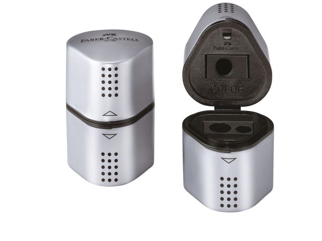 Faber-Castell GREPP 2001 Trio pennvässare har 3 olika öppningar så att du kan vässa färg- och blyertspennor i både standard- och jumbostorlekar. Pennvässarens ergonomiska trekantiga form gör den enkel att använda. Pennvässarna har extra skarpa stålblad och designen skyddar stiftet och förhindrar att det bryts. Denna pennvässare har en stor dubbel behållare som samlar upp resterna och hjälper dig att hålla rent omkring dig.
