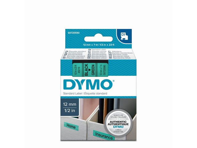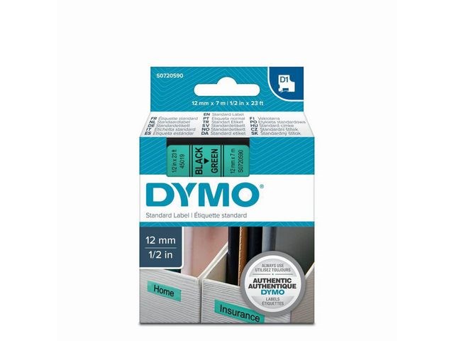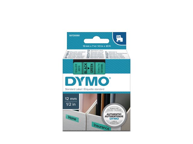 DYMO D1-etiketter erbjuder den prestanda och omväxling du behöver för alla typer av märkning, både inomhus, utomhus, på kontoret, i verkstaden, i butiken eller någon annanstans. Etikettkassetten DYMO® D1 på 12 mm ger snygga, skräddarsydda etiketter med svart text på grön botten som passar perfekt för användning både inomhus och utomhus. D1-tejp med text som har skrivits ut med termisk överföringsteknik