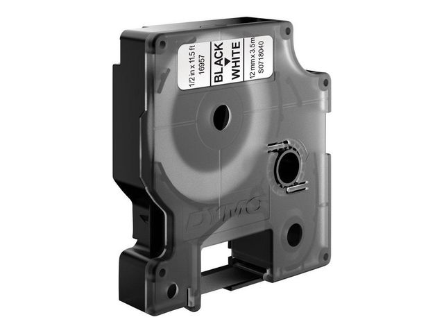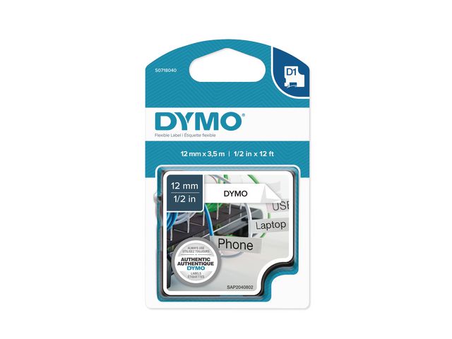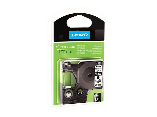 DYMO D1 flexibla nylonetiketter har permanent lim och passar perfekt för märkning av krökta ytor, ytor med struktur eller kablar. DYMO® D1 Flexible Label på 12 mm ger snygga, skräddarsydda etiketter med svart text på vit botten som är snabba och enkla att användas både inomhus och utomhus. D1-tejp med text som har skrivits ut med termisk överföringsteknik