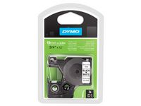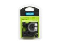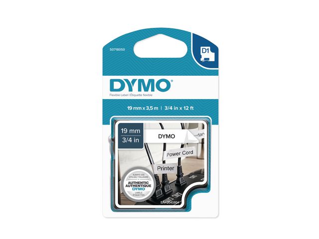 DYMO D1 flexibla nylonetiketter har permanent lim och passar perfekt för märkning av krökta ytor, ytor med struktur eller kablar. DYMO® D1 Flexible Label på 19 mm ger snygga, skräddarsydda etiketter med svart text på vit botten som är snabba och enkla att användas både inomhus och utomhus. D1-tejp med text som har skrivits ut med termisk överföringsteknik