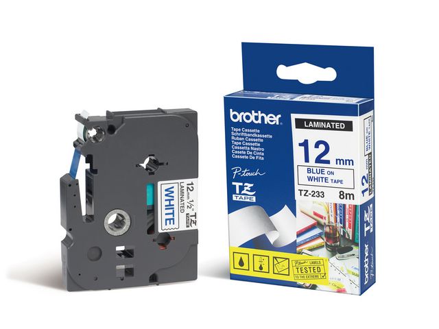 TZ-tejper tål kraftig nötning och långvarig exponering Brothers laminerade TZe-335-tejp är idealisk för användning i vardagen med en rad Brother P-Touch-etikettskrivare för vita etiketter med blått tryck. Denna märkningstejp är kompatibel med Brother P-Touch-etikettskrivare och har ett extra starkt klister som fastnar på slitna ytor. Dessa skimrande etiketter kan användas inomhus och utomhus under normala förhållanden, och passar bäst för plana och jämna ytor. Lamineringen gör etiketterna hållbara med mindre slitage. Etiketterna använder direkt termisk teknik för bläcklös utskrift.