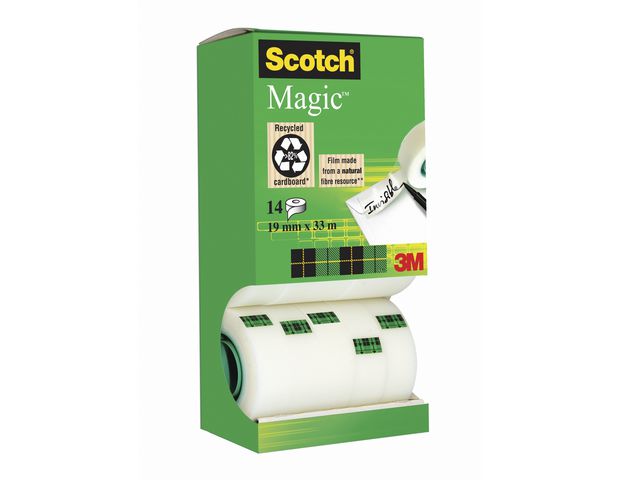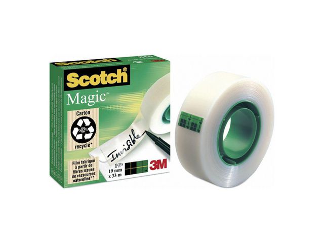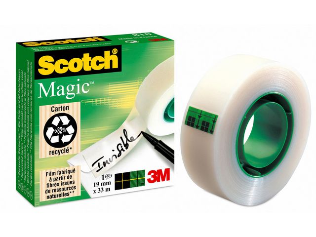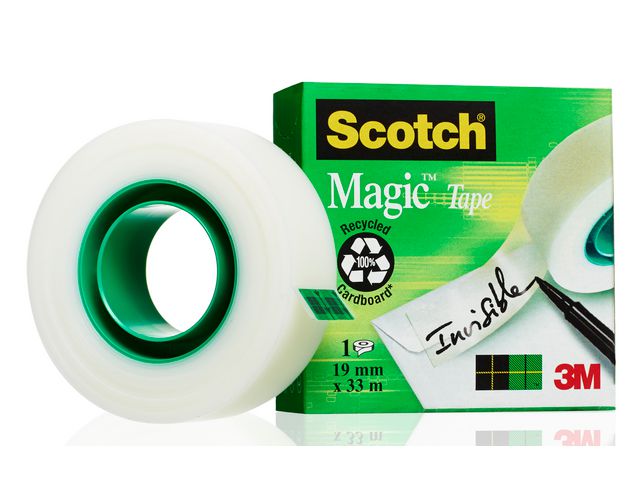 Den osynliga Scotch® MagicT-tejpen har flera funktioner, till exempel som klister eller vid märkning, och den är ett populärt val för hem och kontor. Scotch® MagicT-tejpen appliceras genomskinlig och är ett bra alternativ till klister vid lagning av trasiga böcker eller andra viktiga papper. Med dess släta matta yta är den också osynlig på fotokopior. Denna högkvalitativa genomskinliga tejp kan användas på kartong, papper eller vid inslagning av små paket. Den kan även användas för märkning eftersom det går att skriva på den med en kulspetspenna, blyertspenna eller märkpenna. Tejpen är lätt att skära, riva loss och hantera och kan användas för många olika ändamål i hemmet, skolan eller på arbetsplatsen. Eftersom tejpen inte torkar ut eller gulnar med tiden kommer dina dokument dessutom alltid att behålla ett professionellt utseende. Varje tejprulle är 19mmx33m och levereras i förpackningar om en rulle.