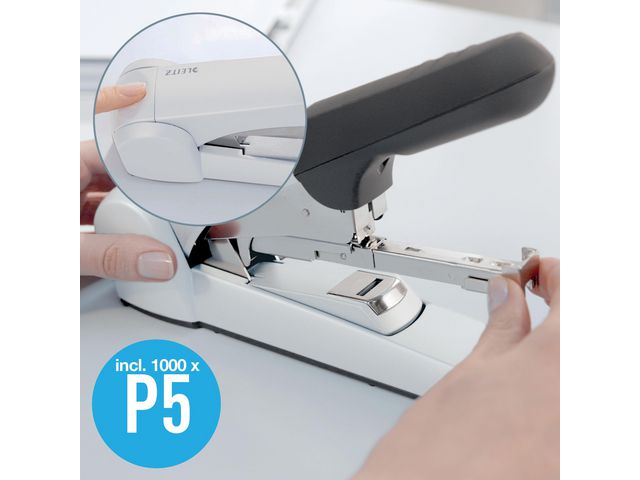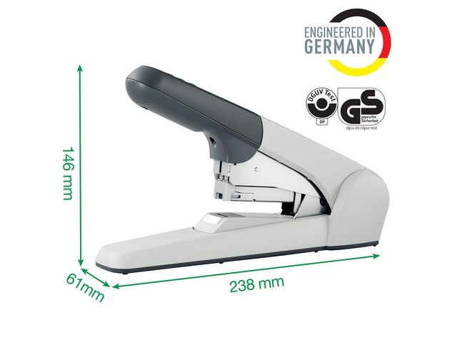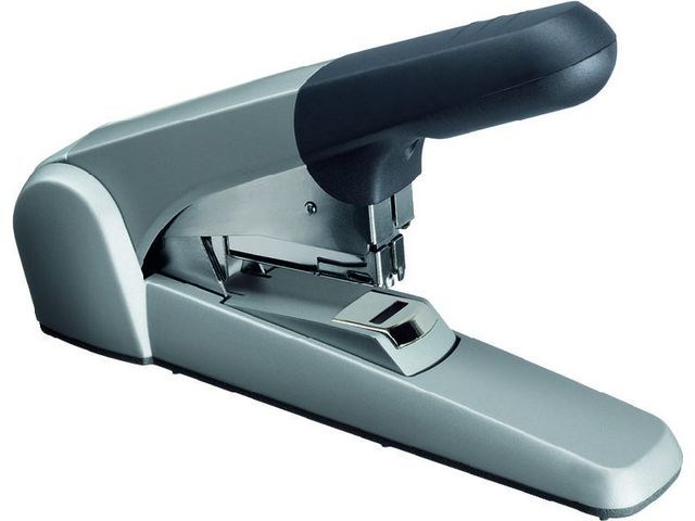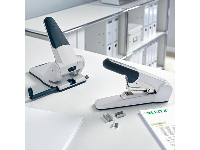 Häftare Leitz 5552 HD60 60 ark Silver. Kraftig häftapparat med Flat Clinch-teknik för häftning av upp till 60 pappersark (80 g/m²). Den här starka häftapparaten häftar enkelt och exakt stora dokument, medan Flat Clinch-funktionen minskar pappershögar och sparar utrymme i dina filer och pärmar. Häftklammerns visningsfönster visar när häftapparaten behöver fyllas på och den frontmatade påfyllningsmekanismen är snabb och enkel att använda. Kraftig häftapparat som är byggd för att hålla, tillverkad av metall kan den repareras med reservdelar för att ytterligare förlänga häftapparatens livslängd. I slutet av sin livstid är den 83% återvinningsbar när den är helt demonterad i de olika materialtyperna. Leitz 5552 Kraftiga Häftapparat omfattas av 10 års garanti när den används med Leitz häftklamrar och är GS-säkerhetstestad.
