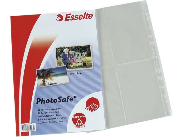 Glasklar förvaring av fotografier i Esselte-fotoficka Håll värdefulla fotografier i gott skick med dessa fotofickor från Esselte. Fickorna är tillverkade av tålig 80 mm tjock polypropylen och bildar en barriär mot fukt och smuts som gör att dina foton håller längre. Lägg i upp till åtta fotografier i var och en av dessa fotofickor från Esselte via öppningarna upptill.