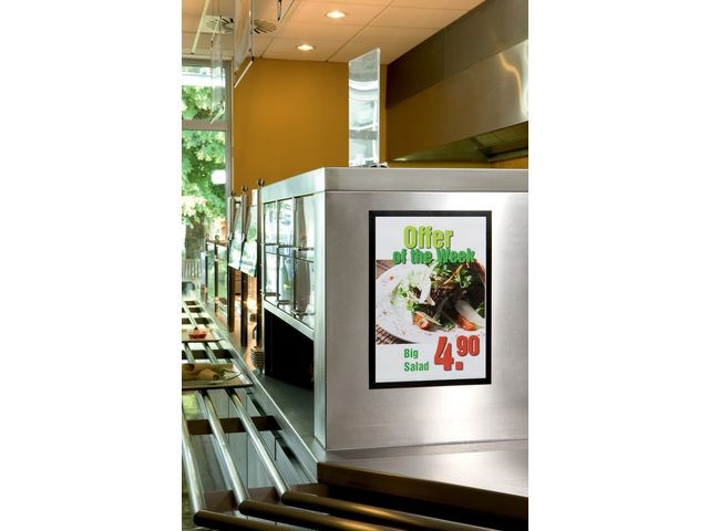 Lättanvänd, självhäftande inforam för att visa olika typer av information på ett stilfullt sätt. För affischer och dokument i A3 format. Använd självhäftande DURAFRAME® inforamar för att visa och presentera kampanjerbjudanden, öppettider, skyltar och annan tillfällig eller mer varaktig information på ett professionellt sätt. Enkelt att sätta i eller skifta budskap genom att lyfta framsidan med magnetstängning. Lätt att sätta upp