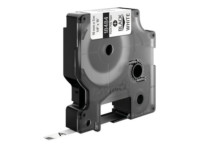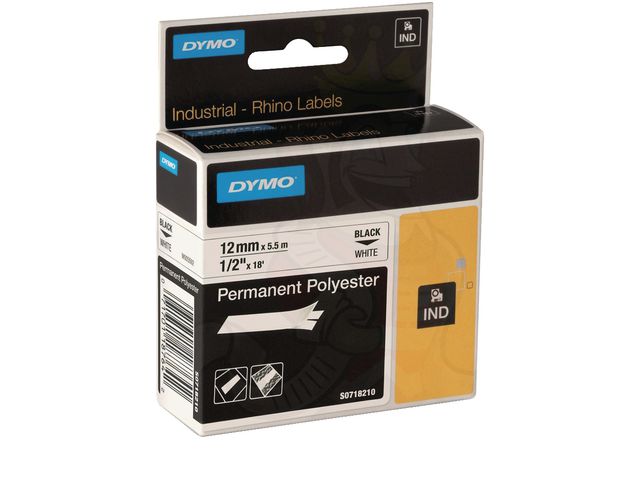 - överensstämmer med RoHS Den permanenta polyesterkassetten DYMO® Rhino på 19 mm matar ut slitstark polyestertejp med svart text på botten i metallic för industrietiketter som ska hålla länge. Perfekt för inomhus- och utomhusbruk vid märkning av soptunnor, paneler, balkar eller hyllor. Texten på Rhino-etiketter skrivs ut med termisk överföringsteknik