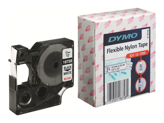 Etiketterna fäster ordentligt på sladdar, kablar, krökta ytor och ytor med struktur. Slitstarkt material tål skador när det dras genom trånga utrymmen eller rörledningar. Följer RoHS 12 mm DYMO® industriella flexibla nylonetiketter fäster permanent på strukturerade ytor och kablar. De perfekta etiketterna för användning både inomhus och utomhus. De är slitstarka, UV-resistenta och tål temperaturer mellan -10 och 80 °C. Etiketterna är utformade för att kunna dras genom trånga utrymmen utan att gå sönder. Enkla att applicera. Dra bara av etikettens skyddsfilm och fäst den där du vill. Ett måste vid bygg- eller kabelhantering. Märk utrustningen för enkel identifiering. UL-godkänd komponent till UL 969, och i enlighet med RoHS.