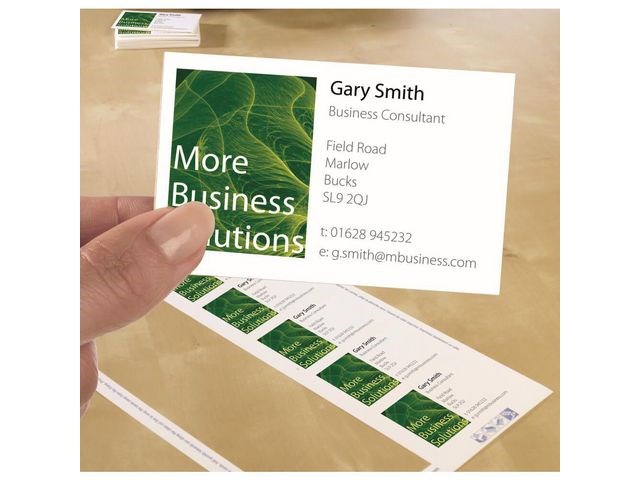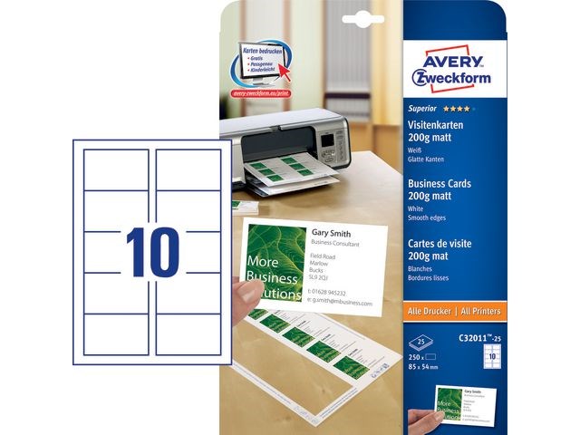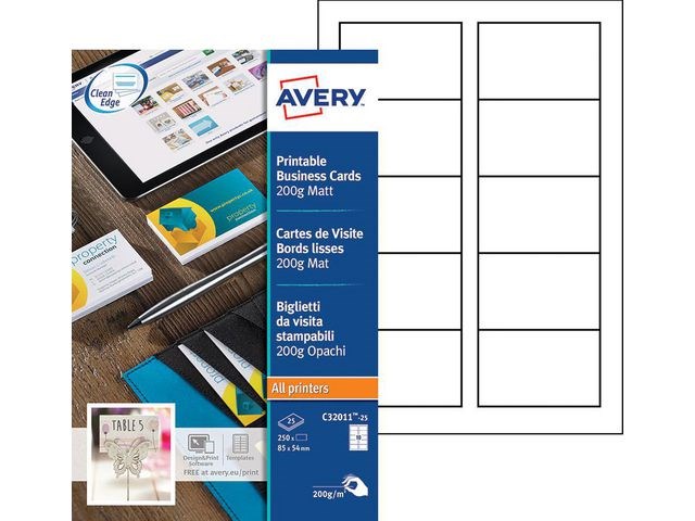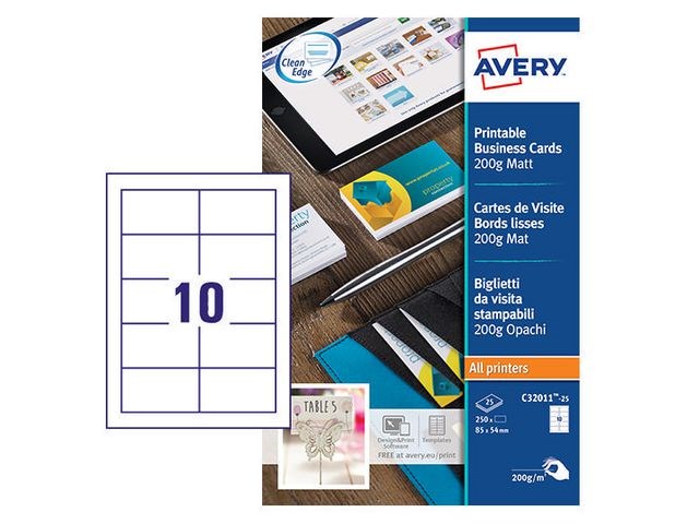 Designa och skriv ut dina egna visitkort i det antal du behöver. Flexibelt, ekonomiskt och snabbt! Ny Quick & Clean patenterad teknik som gör att det går enkelt och snabbt att tillverka professionella kort med helt raka kanter Format 85x54mm. Gratis mallar och programvara till Microsoft® Office kan laddas ner på www.avery.se Passar i: inkjet & laserskrivare Antal per paket: 25ark
