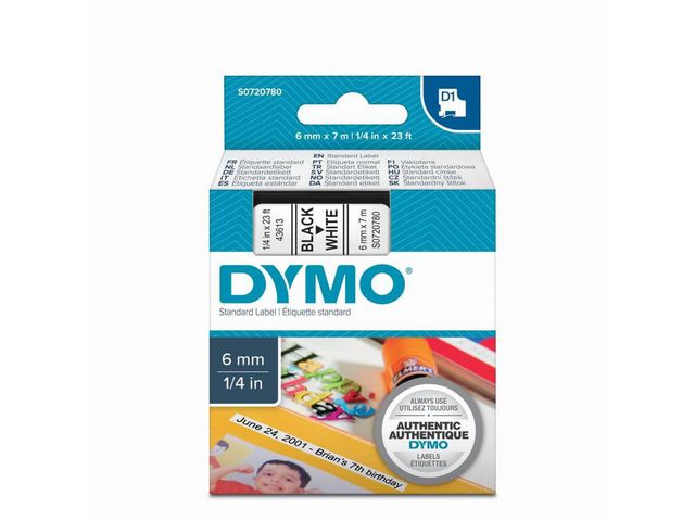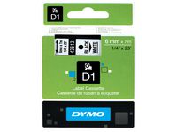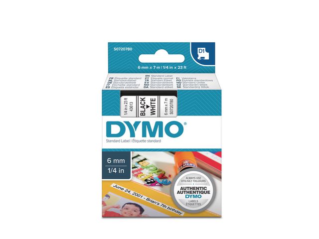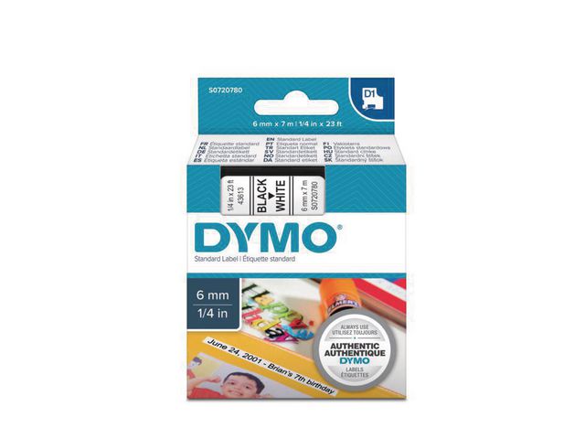 DYMO D1-etiketter erbjuder den prestanda och omväxling du behöver för alla typer av märkning, både inomhus, utomhus, på kontoret, i verkstaden, i butiken eller någon annanstans. Etikettkassetten DYMO® D1 på 6 mm ger snygga, skräddarsydda etiketter med svart text på vit botten som är snabba och enkla att användas både inomhus och utomhus. D1-tejp med text som har skrivits ut med termisk överföringsteknik