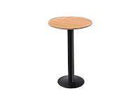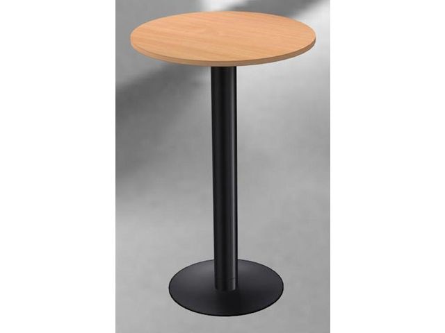 Bordsskiva i boklaminat. Underrede i svartlackerad metall. Mått: Höjd: 110 cm, diam: 70 cm.