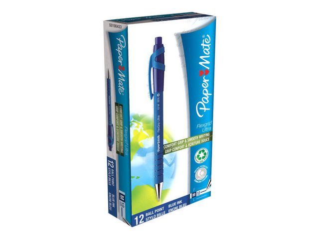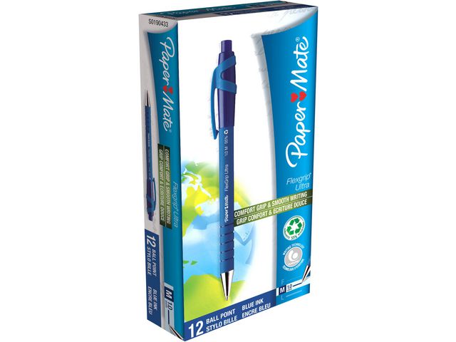 Den här Paper Mate®-kulspetspennan har ett Floating Ball®-bläcksystem som gör den smidig att skriva med. Den ergonomiska pennkroppen i gummi har ett ringformat handtag som gör den bekväm att skriva med. Bläcket är dokumentbeständigt och ljus- och vattentåligt. Den tillverkas också av 55% återvunnet material och är ett miljömedvetet val.
