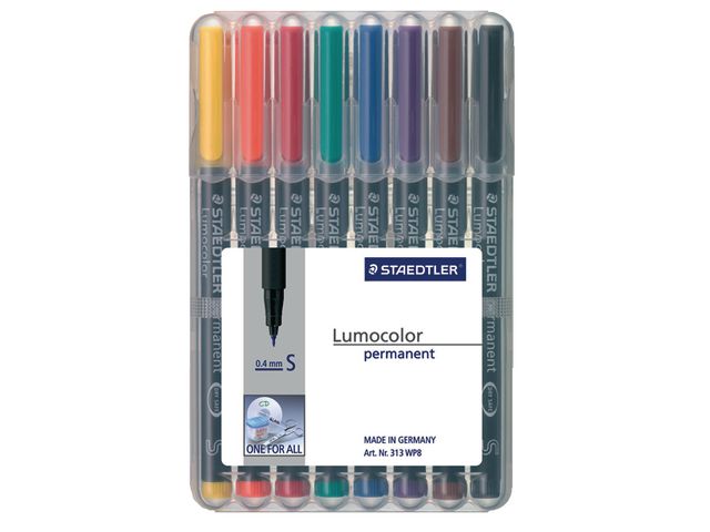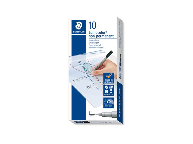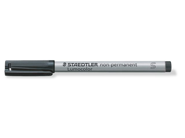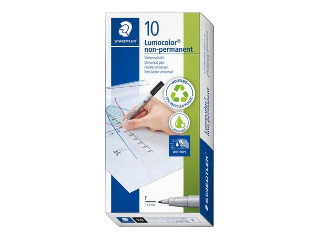 Lumocolor® Non-permanent penna tillverkad av 97 % återvunnen pre-consumer plast, för användning på nästan alla ytor. Lämplig för overheadfilm, kan torkas av med en fuktig trasa. Vattenlösligt bläck. Snabbtorkande. PP-skaft och hätta garanterar lång livslängd. Flygsäker