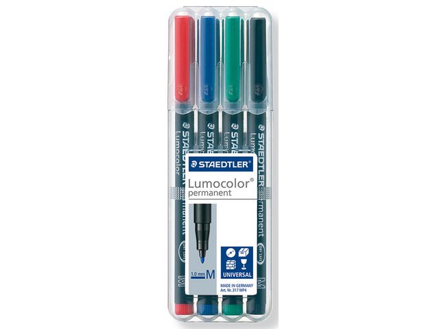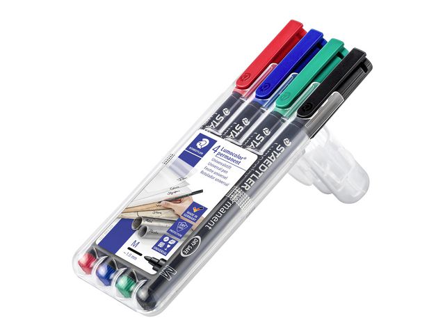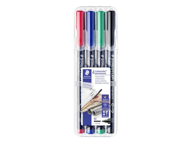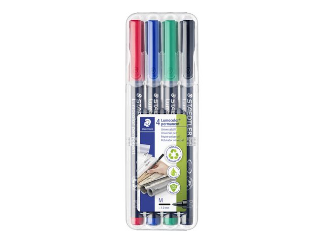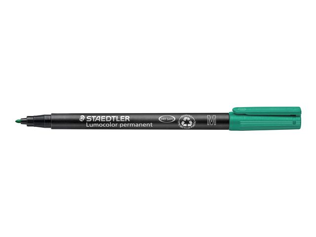 Lumocolor® permanent penna tillverkad av 97 % återvunnen pre-consumer plast, för användning på praktiskt taget alla ytor. Lämplig för overheadfilm. Även lämplig för användning på CD/DVD samt märkning på metall, plast, trä och andra icke-absorberande ytor. Utmärkt kvalitet, smutsavvisande och vattentät. Torkar på några sekunder, därför idealisk för vänsterhänta användare. Permanent, luktfritt bläck. Ljusäkta och väderbeständig i svart färg. PP skaft och hätta säkerställer lång livslängd. kan ligga utan hätta i dagar utan att torka ut. Flygsäker