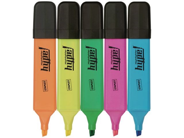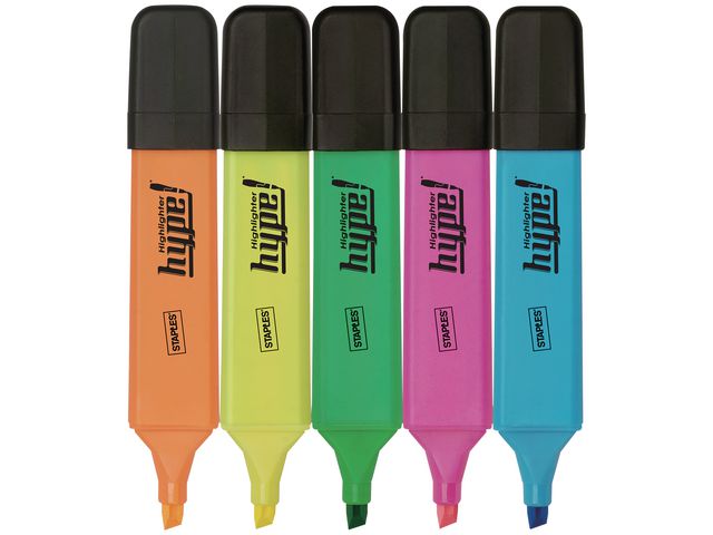Staples® Hype!-överstrykningspennorna i lysande färger gör att du kan markera och stryka under viktig text utan att läsbarheten försämras. Våra Staples®-överstrykningspennor har snedskuren spets som gör det enkelt att både stryka under och stryka över. Det utmärkta vattenbaserade bläcket i de färgade överstrykningspennorna innebär att understrykningen håller längre. Bläcket är dessutom luktfritt och snabbtorkande. Platt plastpennkropp i polypropylen.